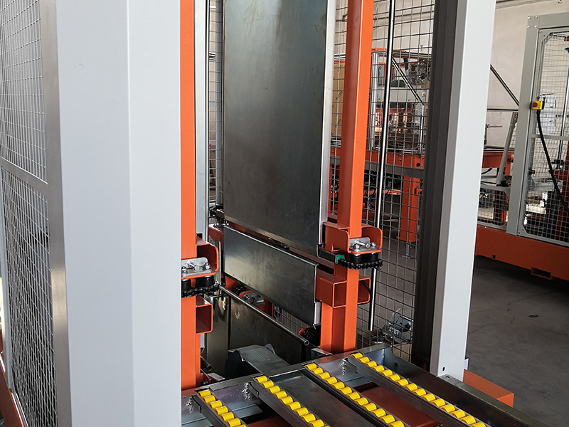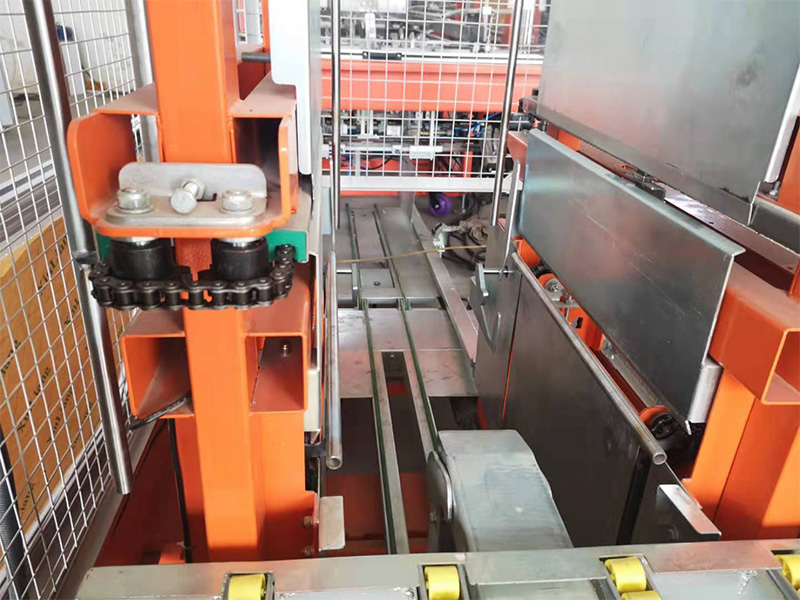 全自動(dòng)堆垛機(jī)放置在紙箱成型區(qū)下部,用于紙箱的收集和堆垛;